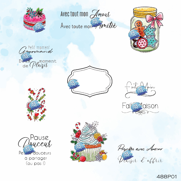 PLANCHE DE 15 TAMPONS NOEL GOURMAND, en caoutchouc naturel bleu vulcanisé, montée sur mousse statique (Ez mount).